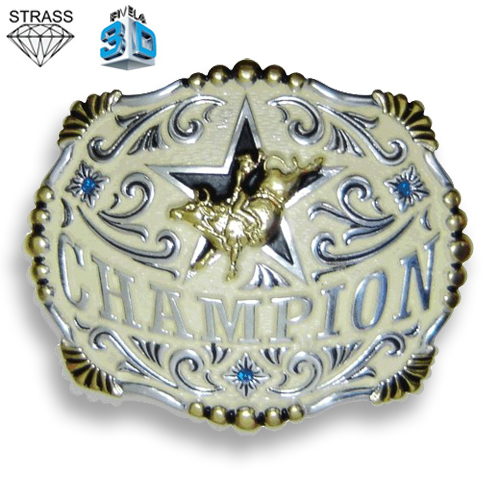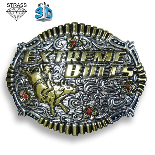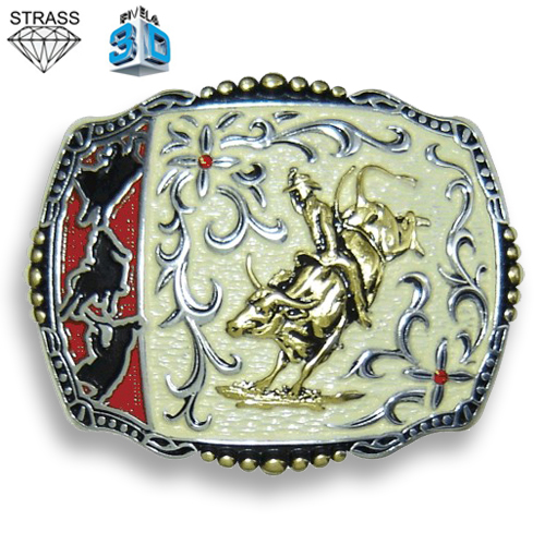 Fivela Pelegrini montaria em touro, fundo branco com detalhes prata e strass.